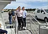 Klima- og miljøminister Andreas Bjelland Eriksen (Ap) går om bord i rutebåten sammen med Kai Steffen Østensen, Arbeiderpartiets førstekandidat i Vest-Agder ved høstens stortingsvalg.