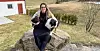 Maria på tunet med hunden Millie og en av de verpevillige hønene.