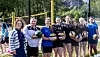 Representant for Gjensidigestiftelsen Gro Trondsen besøker Søgne IL volley med leder Olav Eieland og spillere/trenere Maria, Miriam, Leonora. Benedikte, Tomine Amelle og Maya Rani,